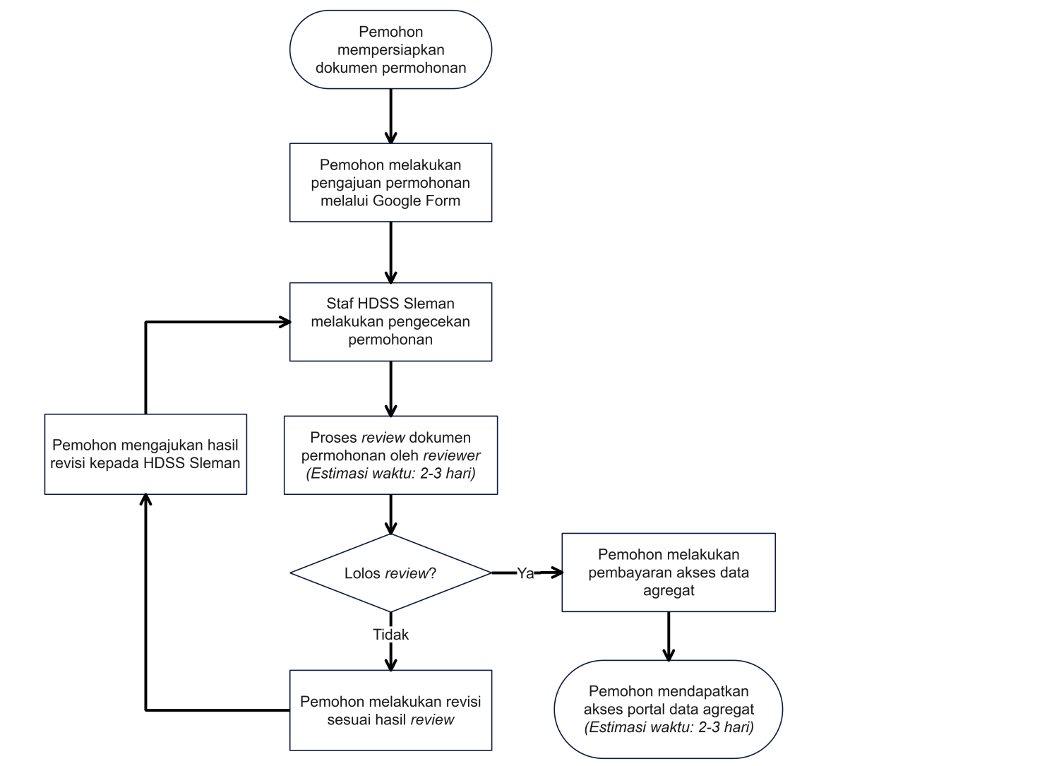 - Estimasi waktu pembuatan set data tergantung dari banyaknya jumlah permohonan data sekunder yang masuk ke HDSS Sleman.
