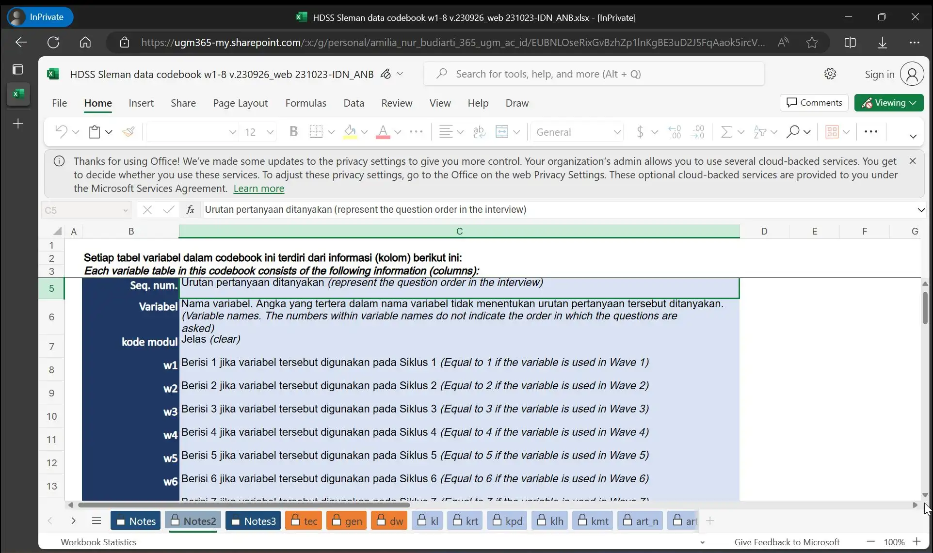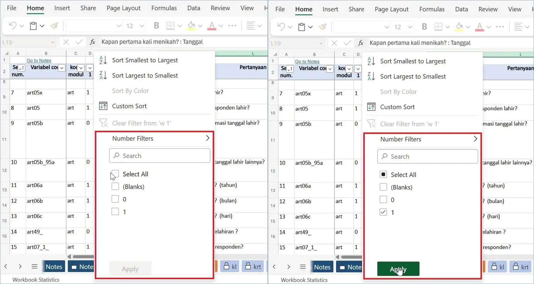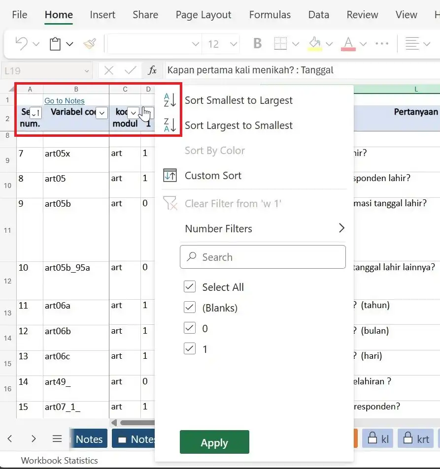 Anda dapat memanfaatkan fitur AutoFilter untuk menemukan, menyembunyikan, atau menampilkan nilai-nilai dalam satu atau lebih kolom tabel codebook. Jadi, jika pengguna ingin melihat daftar variabel yang digunakan dalam Gelombang tertentu, mereka dapat menggunakan AutoFilters dalam kolom w1-w8.