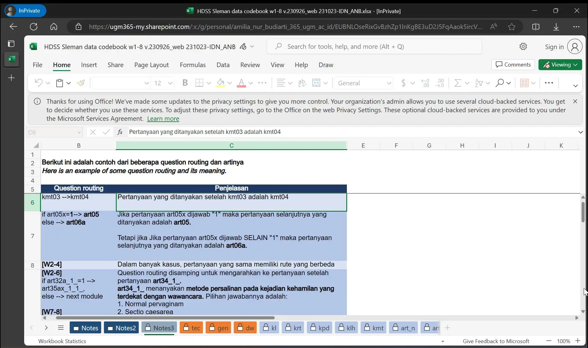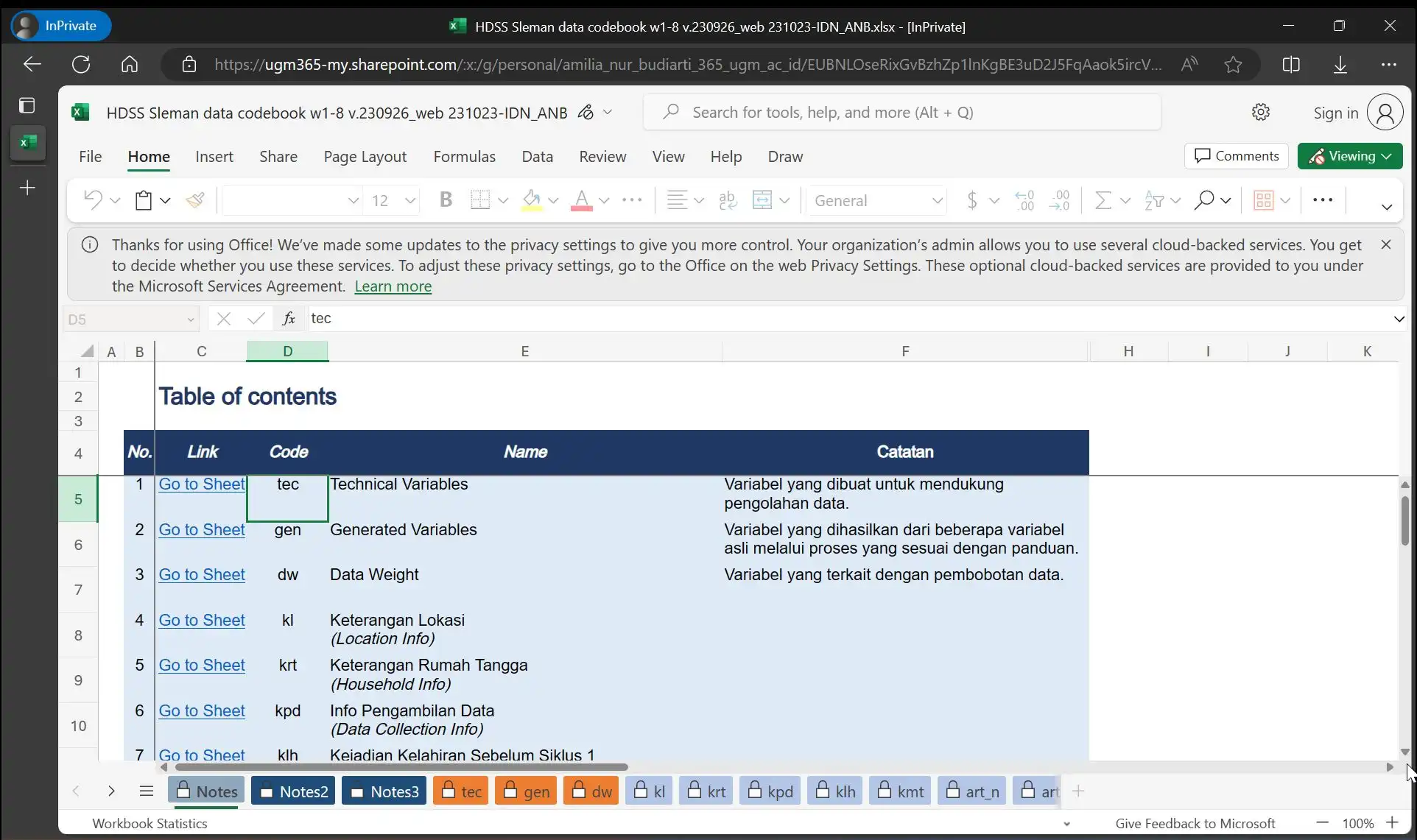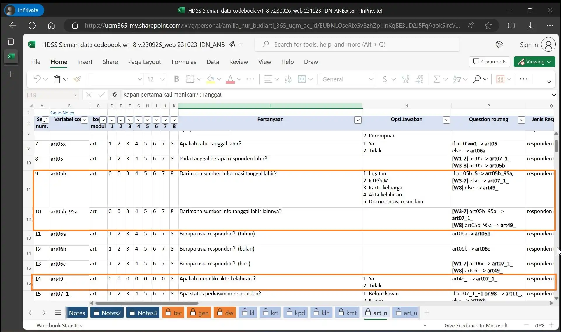 Anda dapat memanfaatkan fitur AutoFilter untuk menemukan, menyembunyikan, atau menampilkan nilai-nilai dalam satu atau lebih kolom tabel codebook. Jadi, jika pengguna ingin melihat daftar variabel yang digunakan dalam Gelombang tertentu, mereka dapat menggunakan AutoFilters dalam kolom w1-w8.